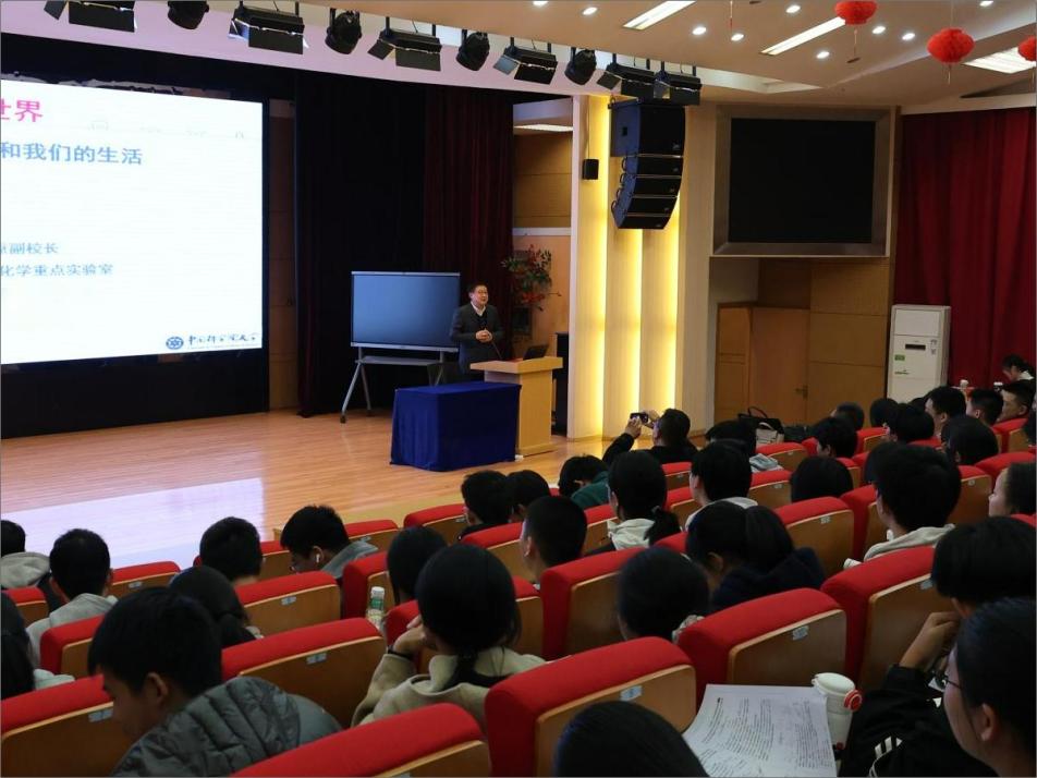 杨国强教授以生活中的常见现象为引,用生动形象的语言向同学们阐释了光化学的基本概念——光化学是研究物质在光的作用下发生化学反应的科学,其核心是光子与物质分子的相互作用。他结合自身三十余年的研究经历补充道:“我早年就开始关注光功能材料的分子设计,发现三芳基硼化合物具有独特的双激发态荧光发射性能,这一发现为开发新型荧光探针奠定了基础。”他通过动态示意图展示了光化学反应的过程,从光子的吸收、电子的跃迁到新物质的生成,将抽象的化学原理转化为直观易懂的视觉呈现,让在场同学对“光如何改变物质”有了清晰的认知。